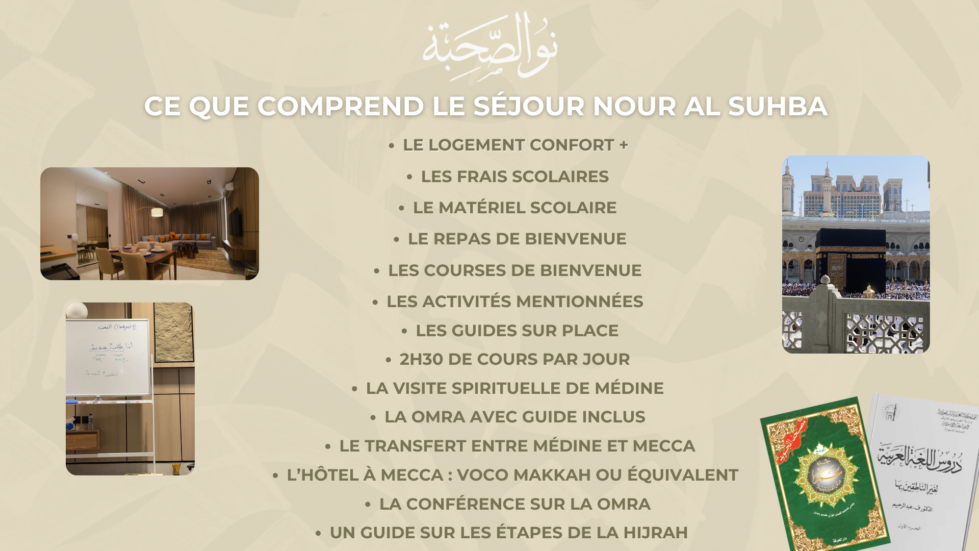 Nour Al-Suhba est un programme pensée pour les femmes et l'hébergement ainsi que les cours de langue sont destinée uniquement aux femmes. Par conséquent, votre mahram peut voyager avec vous mais devra trouver une option pour séjourner dans Médine.